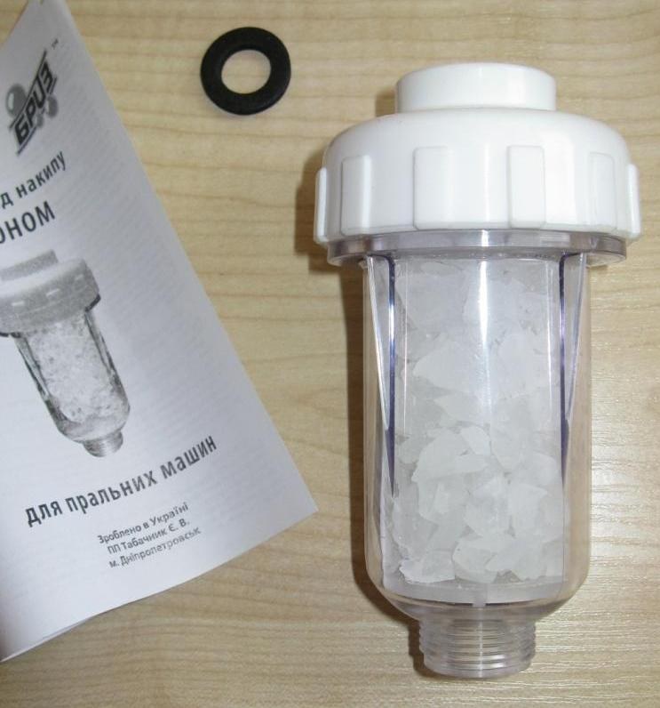 Фильтр содержит полифосфатную засыпку, которая при прохождении воды растворяется в микродозах и связывает соли жёсткости. Это предотвращает отложение известкового налёта на ТЭНе и внутренних деталях машины. Особенно актуален для регионов с жёсткой водой, где накипь — основная причина выхода техники из строя.