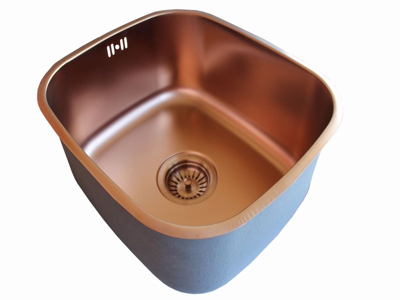 Мойка изготовлена из нержавеющей стали с декоративным покрытием медного оттенка. Глубина чаши позволяет комфортно мыть посуду средних размеров и овощи. Гладкие скруглённые углы упрощают очистку — грязь не скапливается в труднодоступных местах.