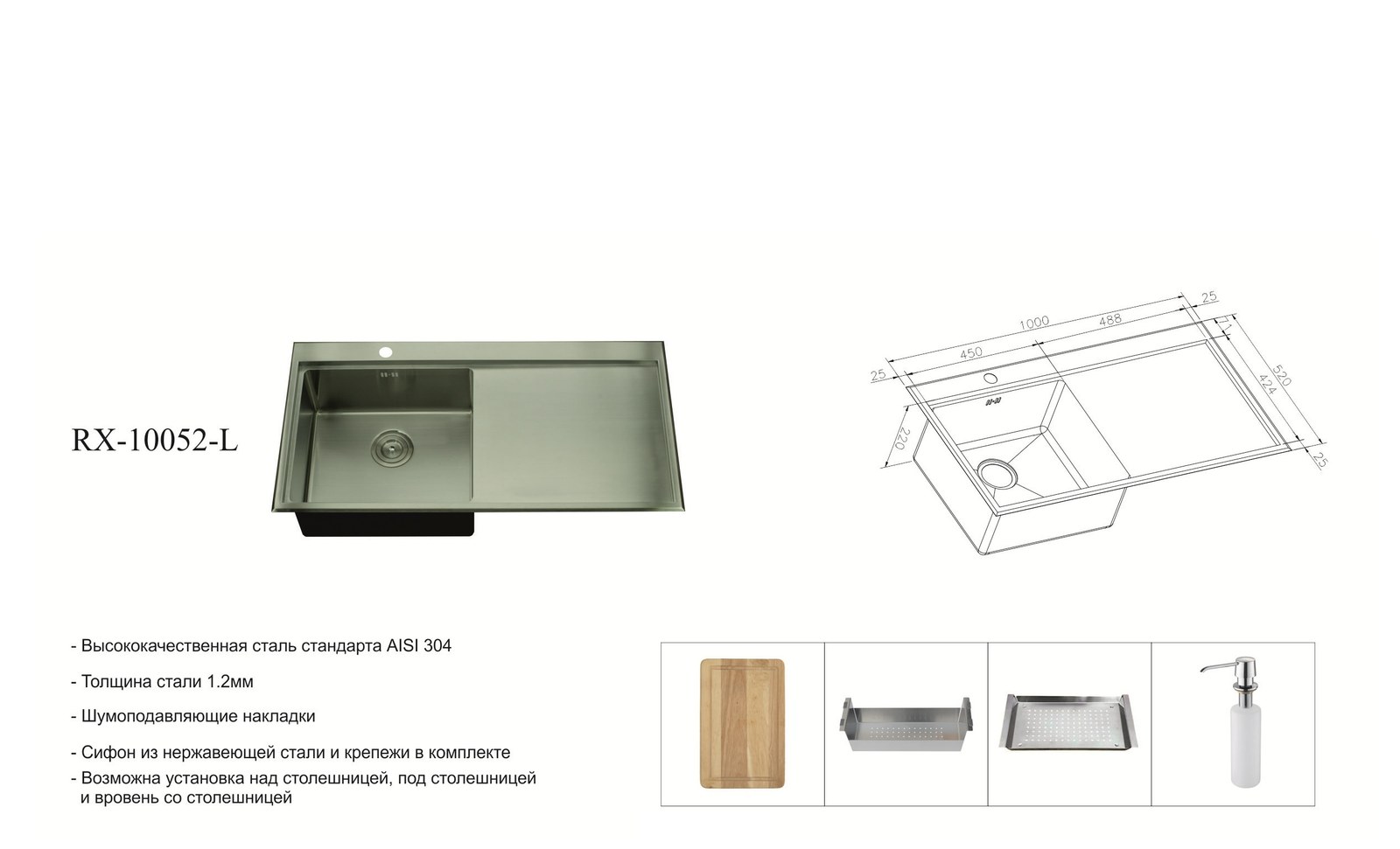 - Выбирала именно левостороннюю модель под планировку кухни, и не прогадала. Сталь толстая, не прогибается, пятна от воды легко убираются обычной губкой. Установка потребовала точной разметки, но мастер справился без проблем.