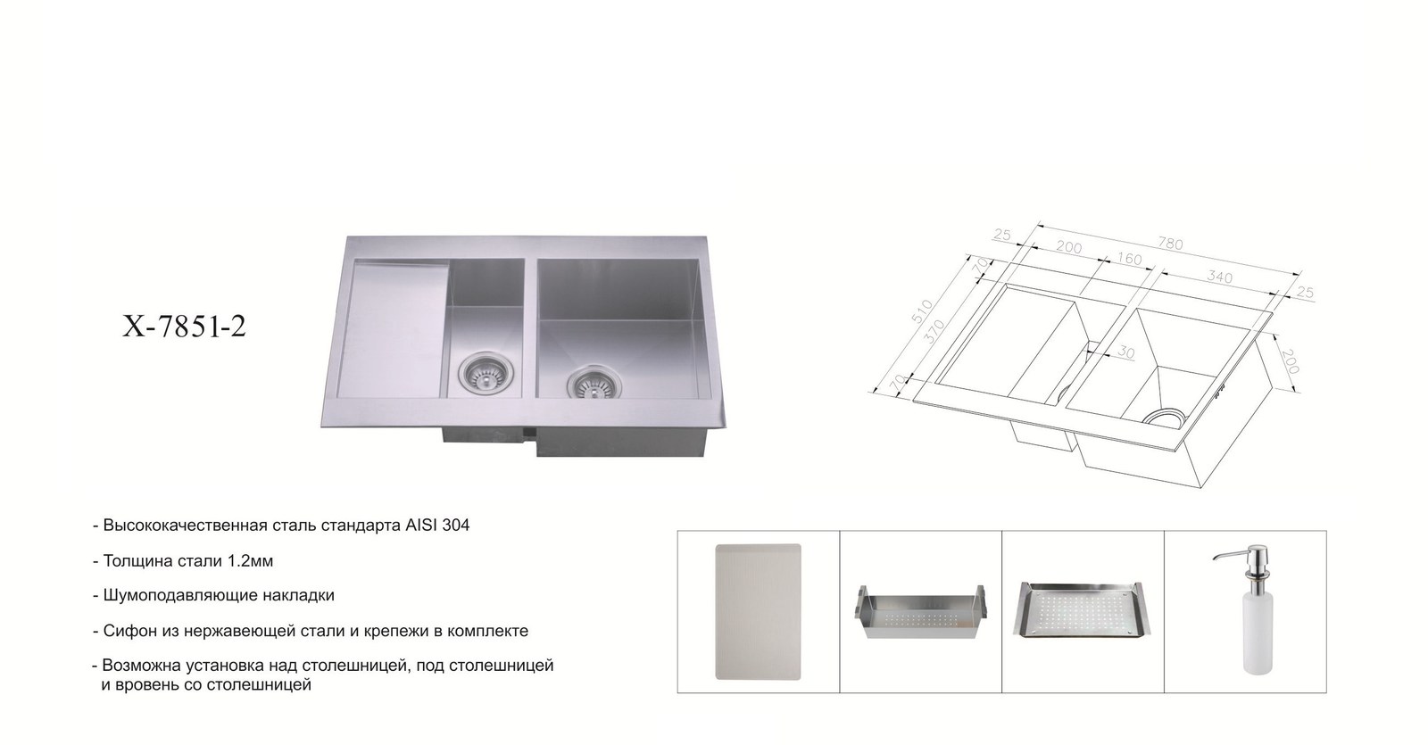 Мойка ZorG INOX X-7851-2 — врезная кухонная мойка из нержавеющей стали