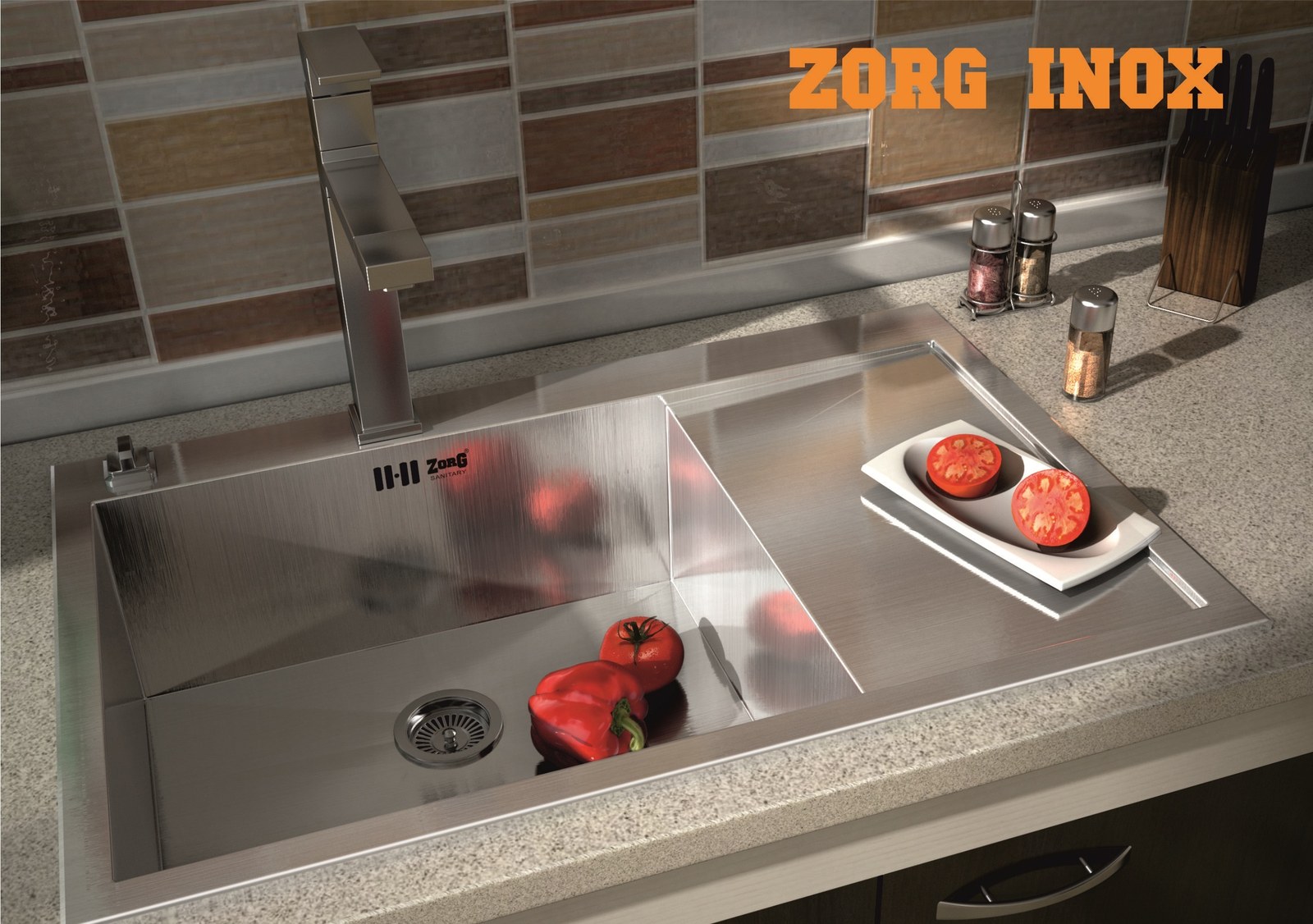 Практичная угловая кухонная мойка ZorG INOX из износостойкой нержавеющей стали идеально вписывается в столешницы от 80 см.