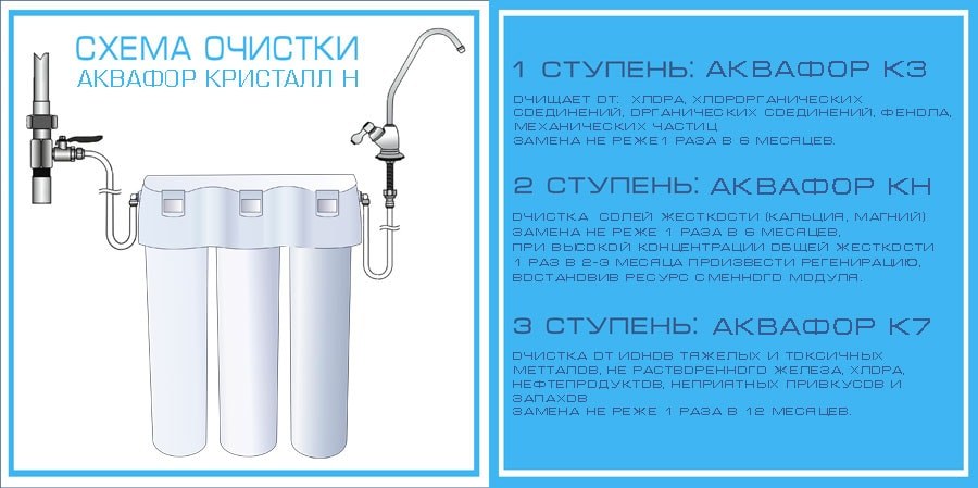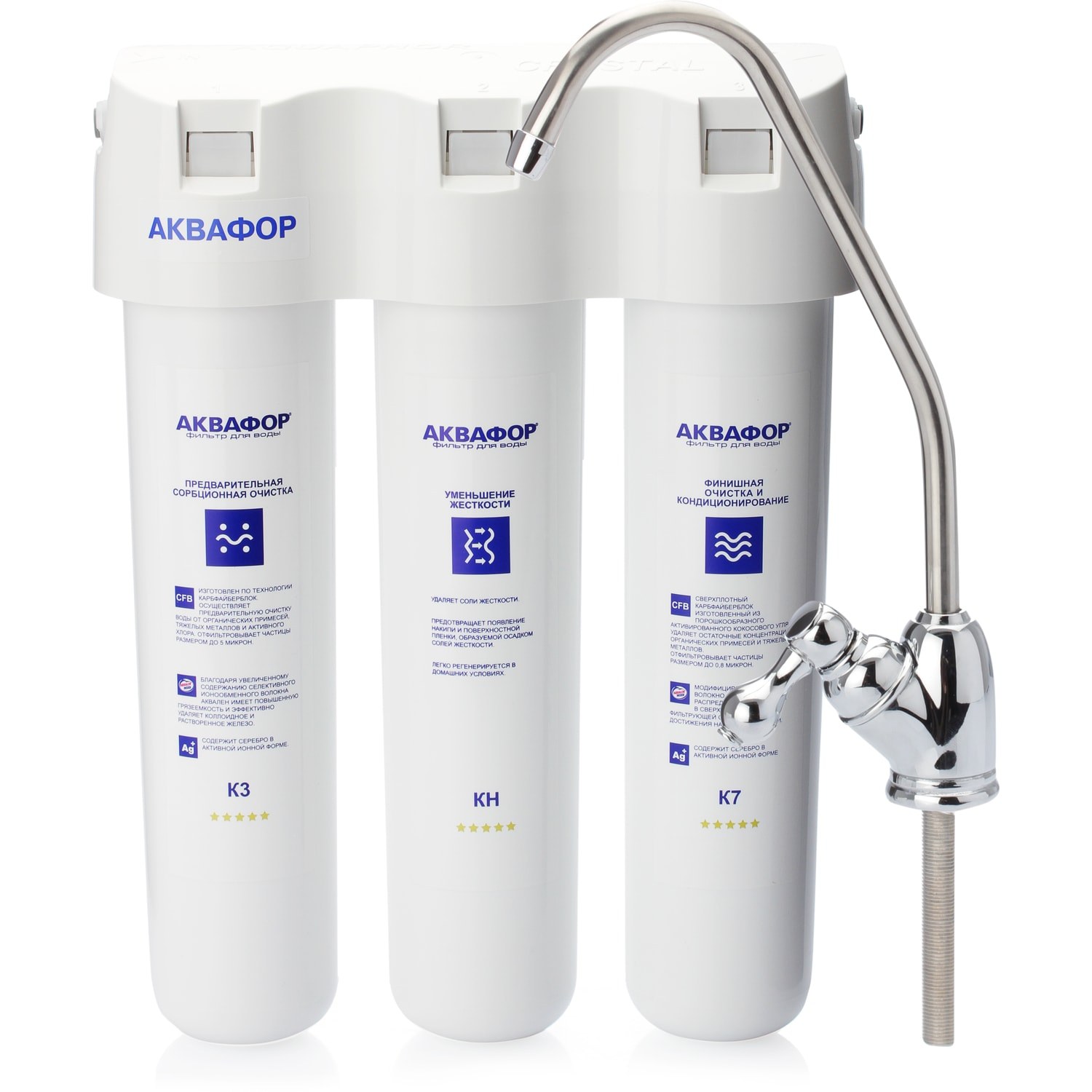 Аквафор Кристалл Н — трёхступенчатая система фильтрации воды под мойку, которая эффективно справляется с жёсткостью и примесями. Фильтр устанавливается под кухонную раковину и подключается к водопроводу, обеспечивая постоянный доступ к очищенной воде через отдельный кран.