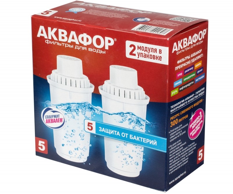Комплект из двух сменных кассет Аквафор B100-5 эффективно очищает воду от хлора, тяжёлых металлов и неприятных запахов.