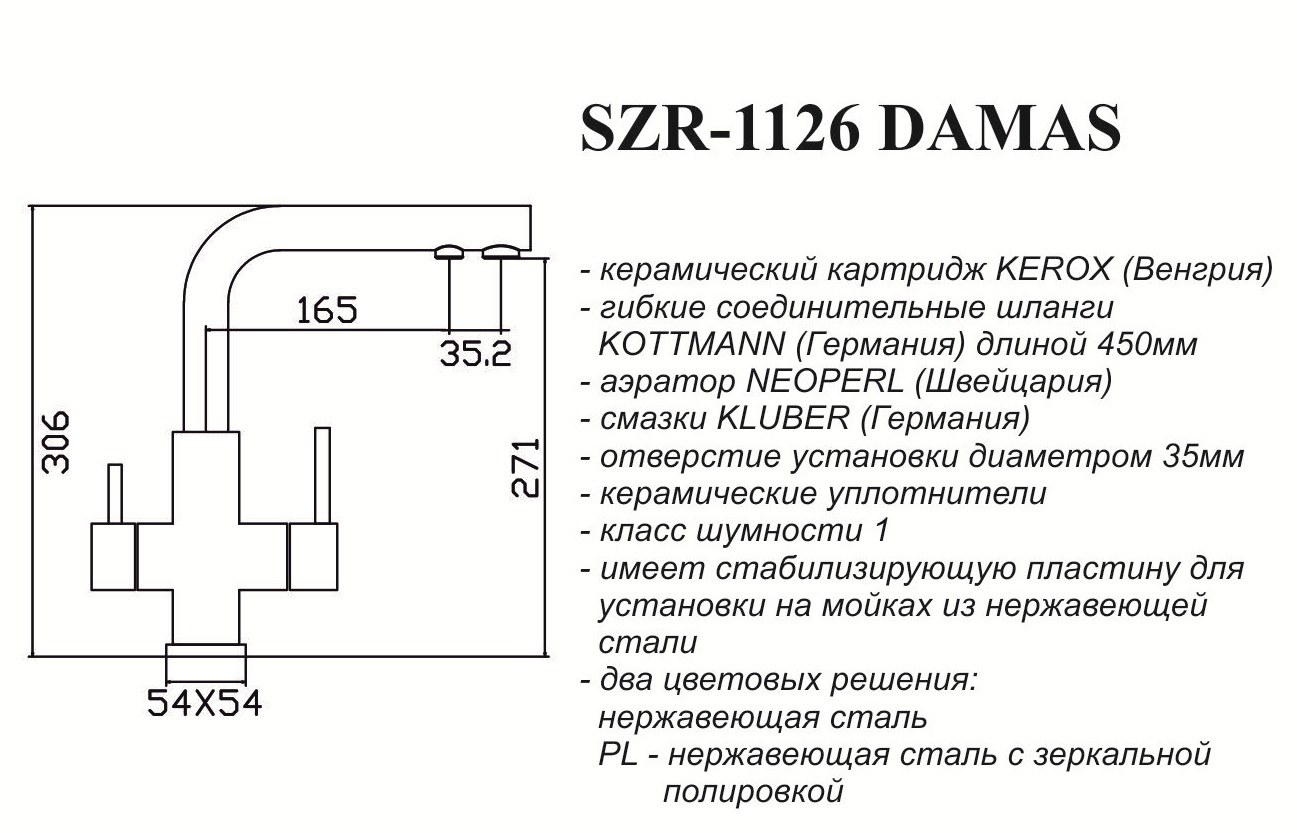 Смеситель ZorG InoX SZR-1126 DAMAS предназначен для подачи очищенной питьевой воды из фильтра. Устанавливается на кухонную мойку как дополнительный кран — отдельно от основного смесителя. Модель выполнена из нержавеющей стали, что исключает коррозию и обеспечивает гигиеничность при контакте с питьевой водой.
