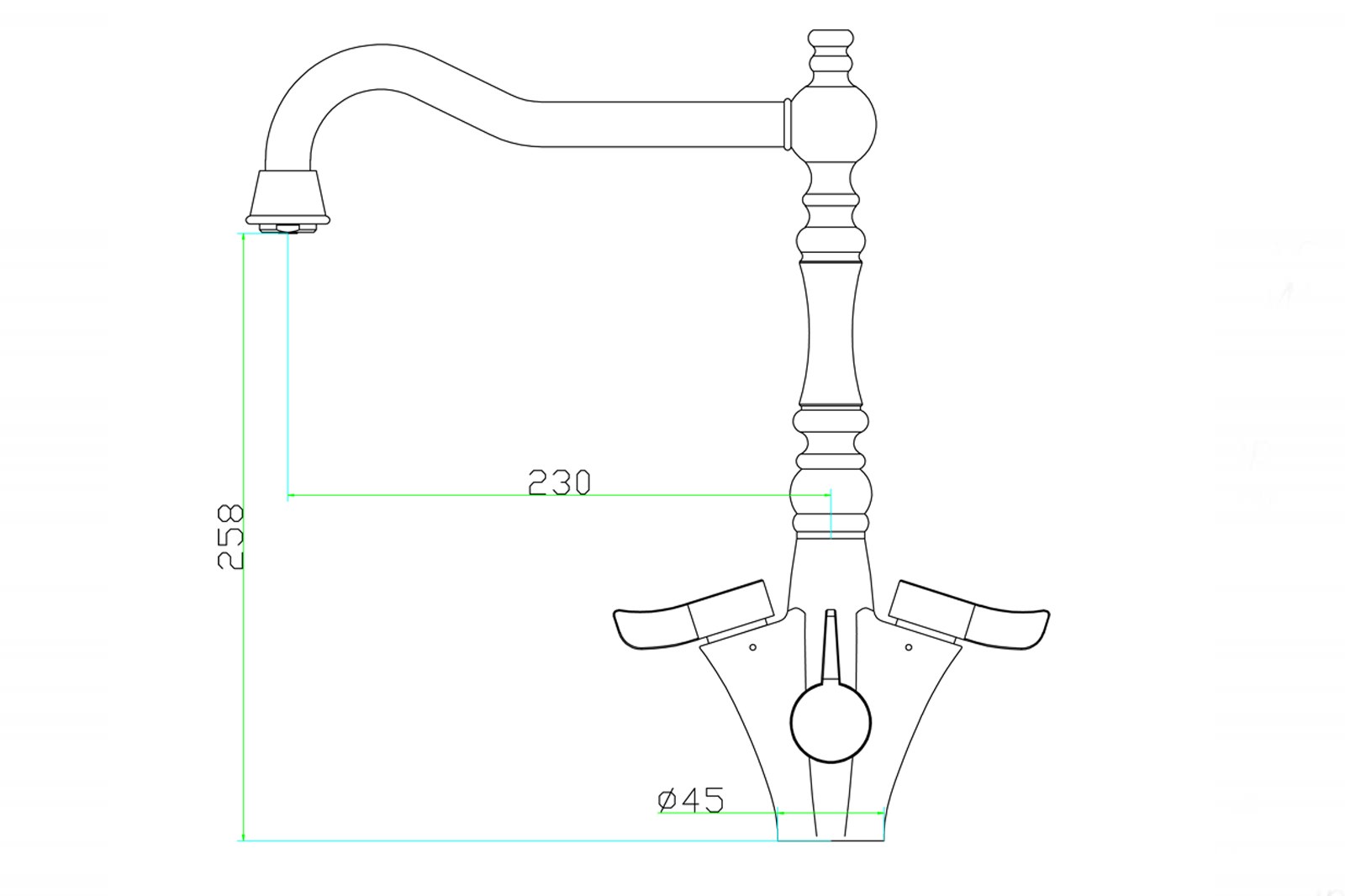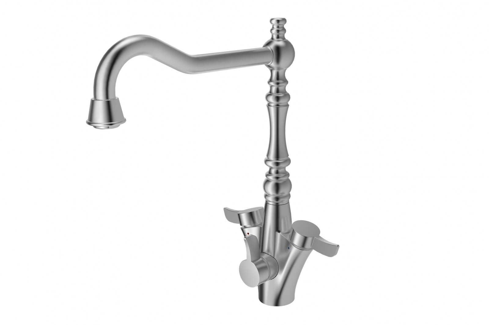 Кран оснащён керамическим механизмом управления, что обеспечивает плавное открытие и закрытие подачи воды. Компактный излив удобен для наполнения стаканов, графинов и чайников. Монтаж осуществляется в отверстие столешницы или мойки стандартного диаметра.