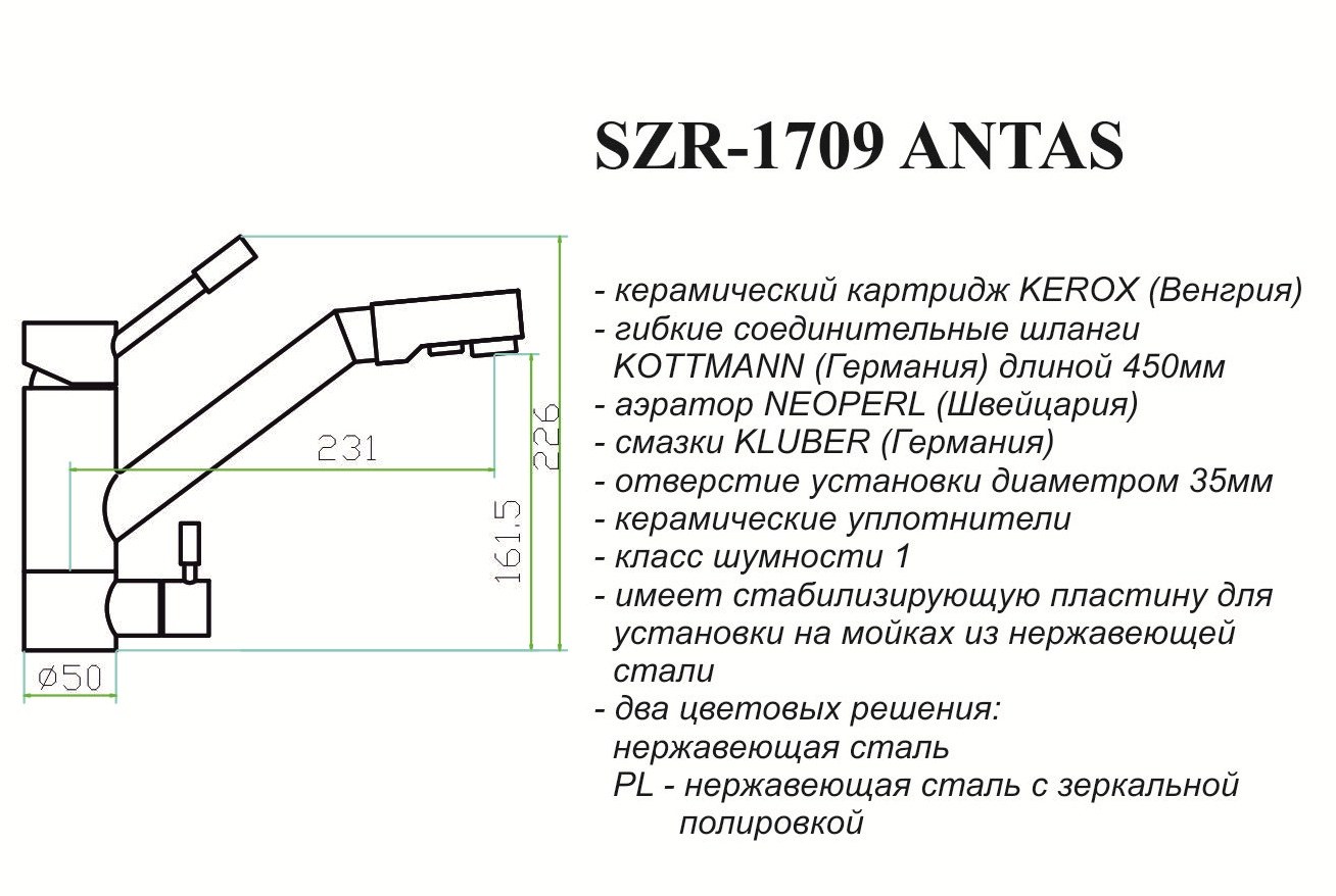 Смеситель ZorG InoX SZR-1709 ANTAS предназначен для подачи очищенной питьевой воды из фильтра. Устанавливается на кухонную мойку как дополнительный кран — отдельно от основного смесителя. Модель выполнена из нержавеющей стали серии InoX, что исключает коррозию и окисление при постоянном контакте с водой.