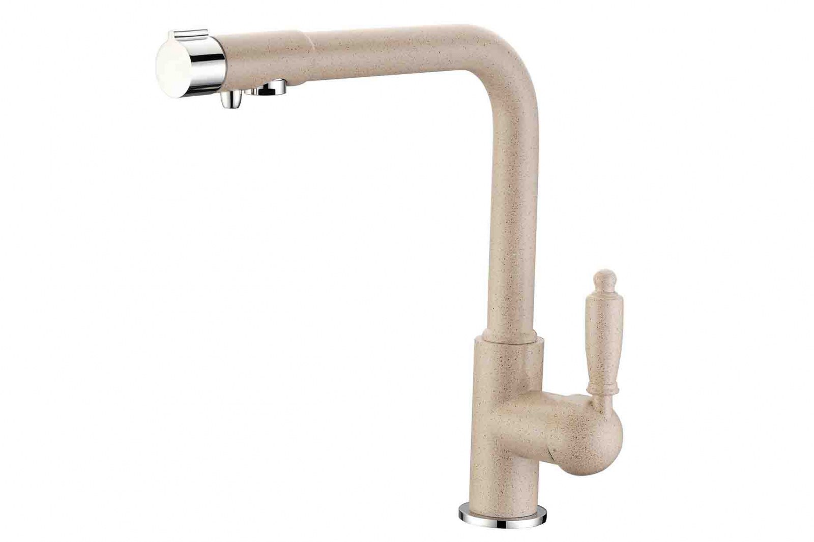 Смеситель ZorG для питьевой воды в песочном цвете идеально дополнит кухню с бежевой мойкой и столешницей из искусственного камня.