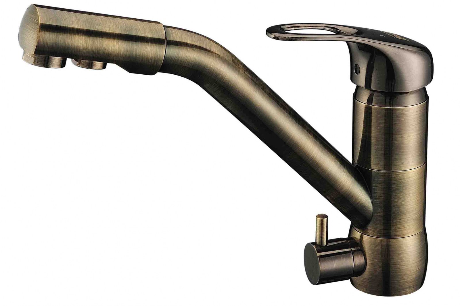 Этот смеситель предназначен для кухни, где установлена система фильтрации воды. Отдельный кран для питьевой воды позволяет не смешивать очищенную воду с водопроводной и продлевает срок службы фильтрующих картриджей. Цвет «антик» с эффектом состаренной бронзы хорошо впишется в кухни классического стиля, прованс или лофт.