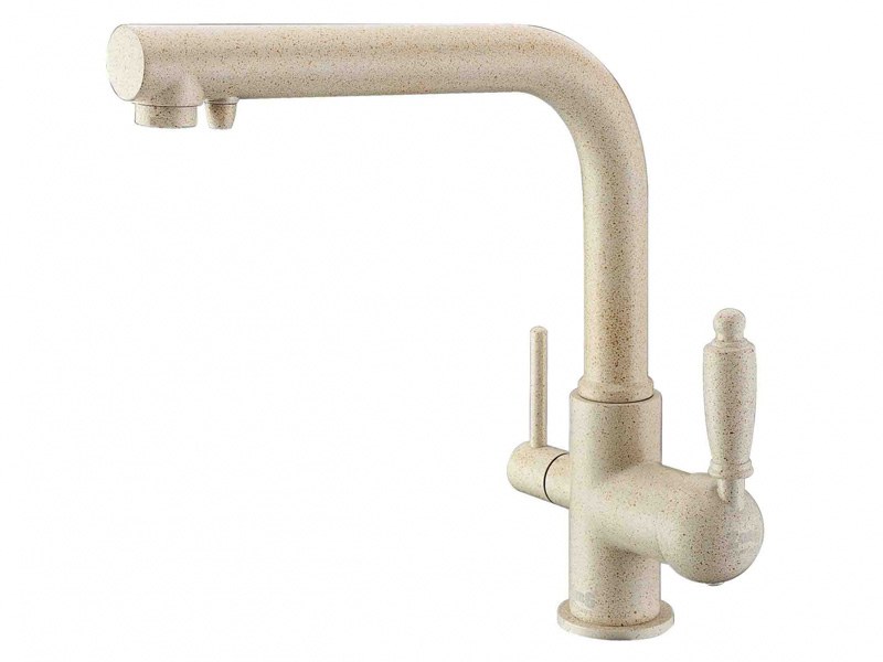 Смеситель рассчитан на тех, кто использует фильтр для питьевой воды и хочет избежать установки второго крана на мойке. Подходит для кухонь с гранитными или композитными мойками в бежевых и серых тонах.