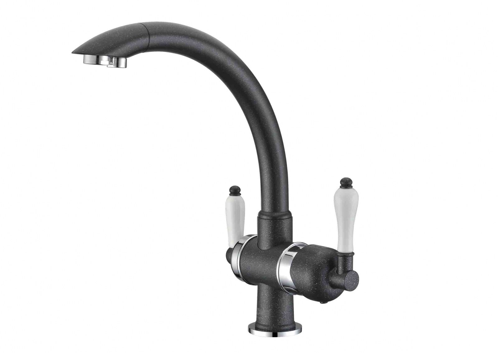 Эргономичный смеситель ZorG ZR 327 YF объединяет подачу водопроводной и фильтрованной воды в одном корпусе из хрома с черным металликом, экономя место на мойке и обеспечивая стильный дизайн для современной кухни.