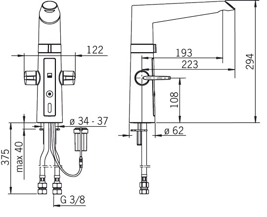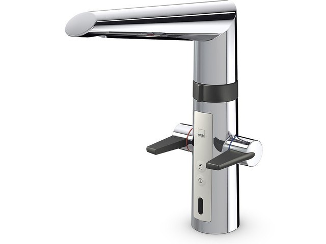 Электронный смеситель ORAS Optima New 2720F обеспечивает бесконтактное включение воды инфракрасным датчиком для максимальной гигиены и экономии ресурсов.