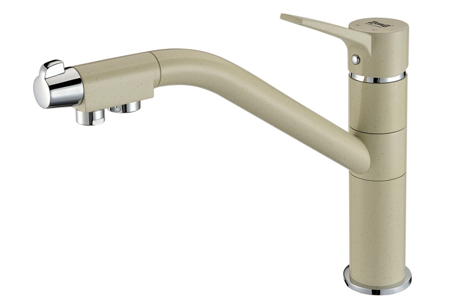Практичный кухонный смеситель ZorG ZR 401-KF в элегантном цвете шампань объединяет подачу чистой питьевой воды из фильтра и обычной водопроводной воды в одном корпусе, экономя место на мойке при стильном дизайне для современного интерьера.