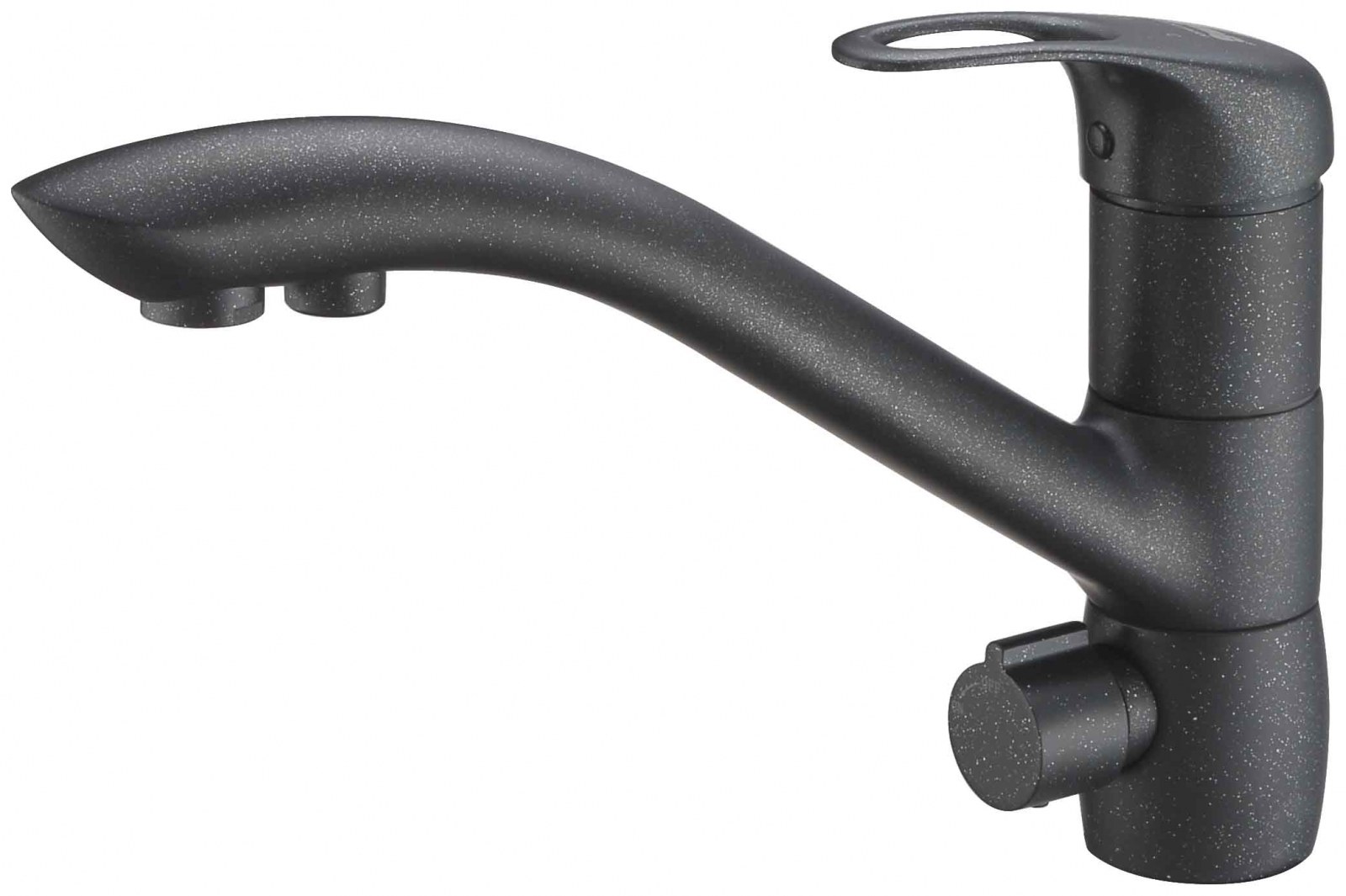 Смеситель рассчитан на тех, кто использует систему фильтрации воды под мойкой и хочет получить единый эстетичный кран вместо двух отдельных. Чёрное матовое покрытие хорошо сочетается с тёмными столешницами, каменными мойками и кухнями в стиле лофт или минимализм.