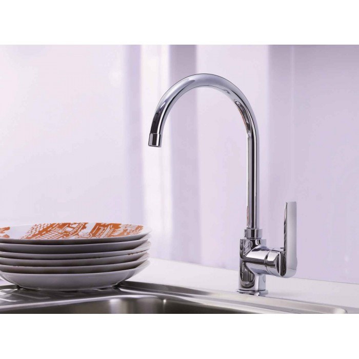 Практичный кухонный смеситель Teka с поворотным изливом для удобного мытья посуды в любой зоне раковины.