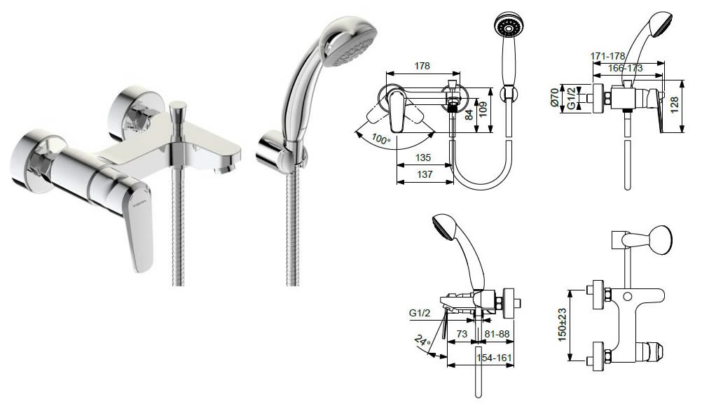 Однорычажное управление позволяет быстро регулировать температуру и напор воды одной рукой. Переключение между изливом и душем осуществляется встроенным дивертором. Настенный монтаж на стандартные эксцентрики с межосевым расстоянием 150 мм — подходит для большинства ванных комнат без переделки подводки.