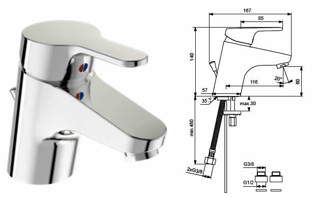 Однорычажный смеситель болгарского производства для установки на раковину в ванной комнате. Модель поставляется без донного клапана, что позволяет использовать её с раковинами любой конфигурации или подобрать клапан отдельно под конкретные задачи.