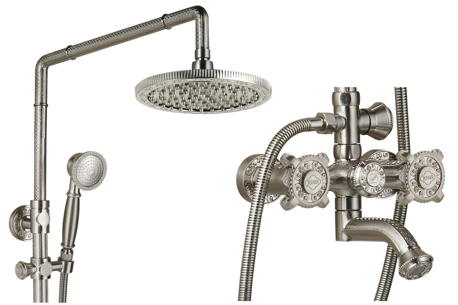 Душевая стойка ZorG Antic в стиле ретро с верхним тропическим душем и двухвентильным смесителем идеально дополнит классический интерьер ванной комнаты, обеспечивая надежную работу и элегантный дизайн серебристого цвета.