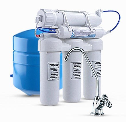 Многоступенчатая система фильтрации включает предфильтры для механической очистки и мембрану обратного осмоса. Накопительный бак позволяет всегда иметь запас очищенной воды. Отдельный кран для питьевой воды монтируется на мойку или столешницу.